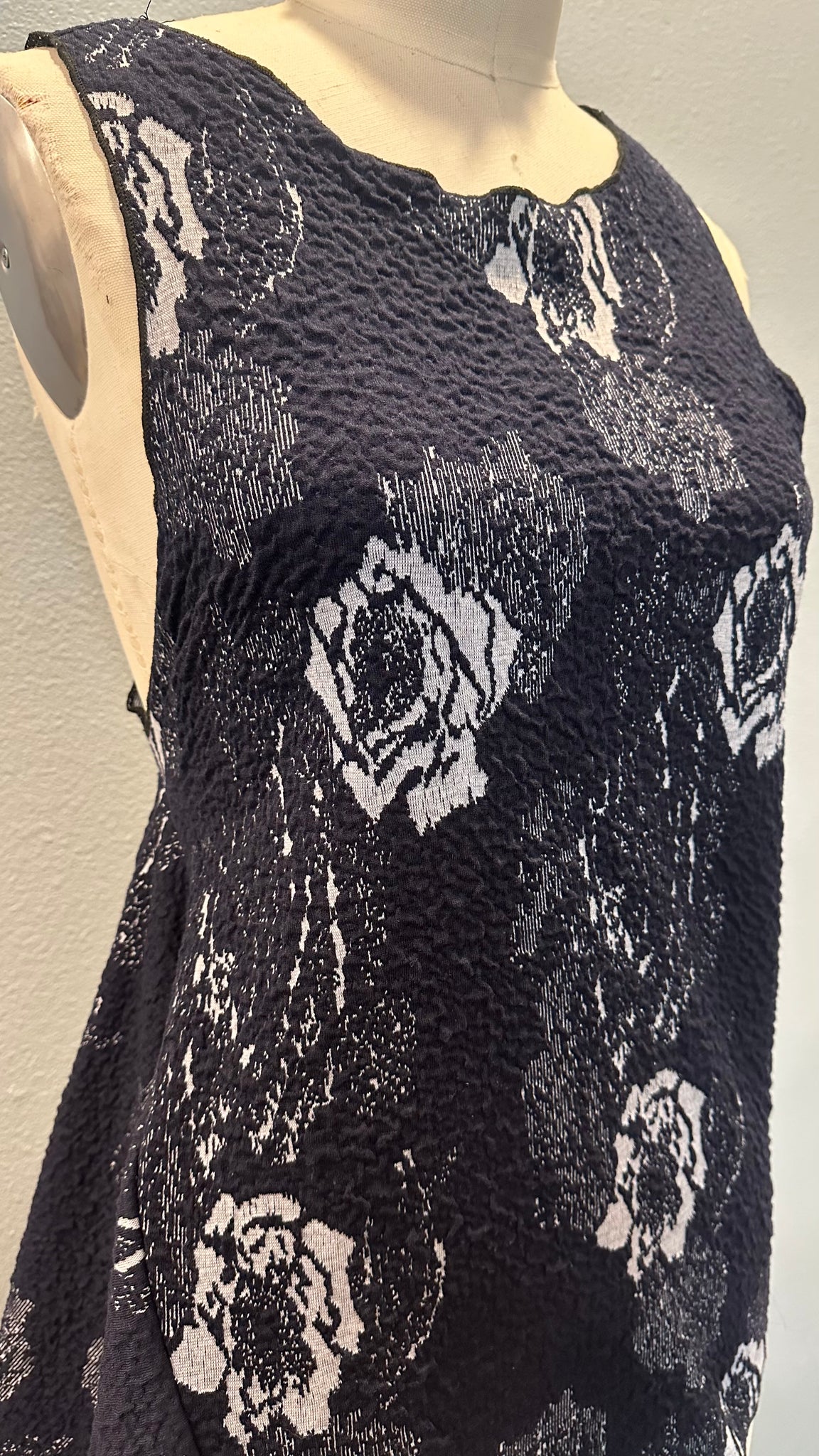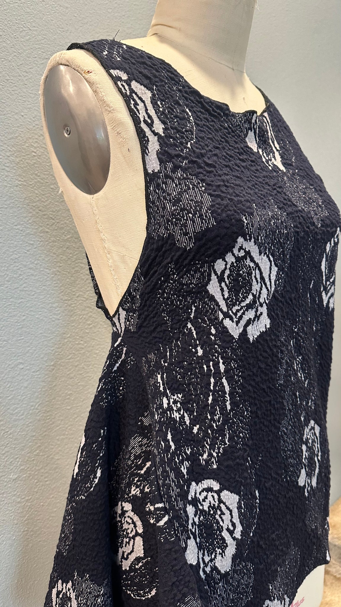 Command attention from dusk till dawn in the Midnight Bloom Top — a sculptural, sleeveless statement piece in deep midnight blue, scattered with soft white florals. Crafted from a thick stretch knit, this top hugs your shape while offering all-day comfort and structure.