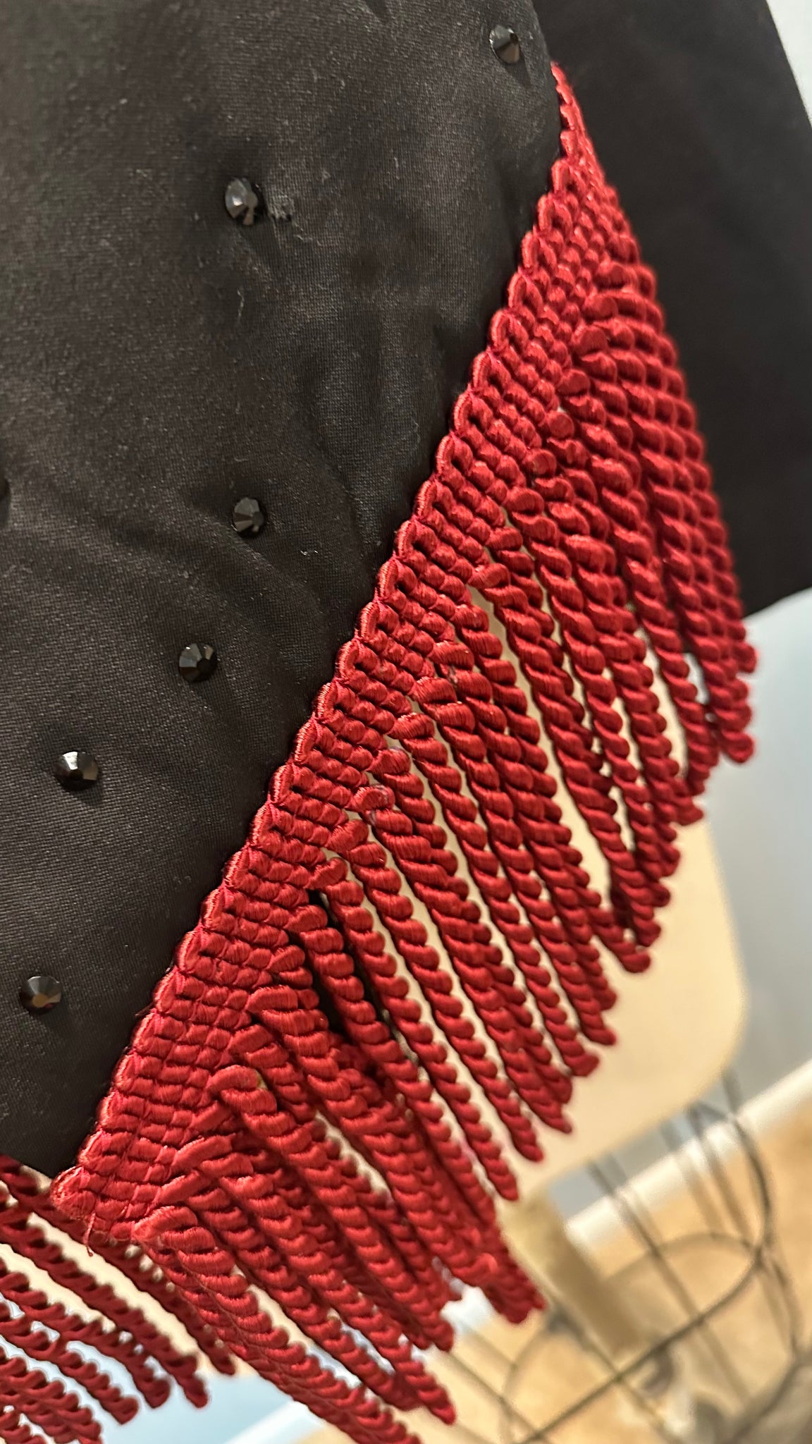 Luxe black suiting fabric with satin burgundy trim for sharp contrast